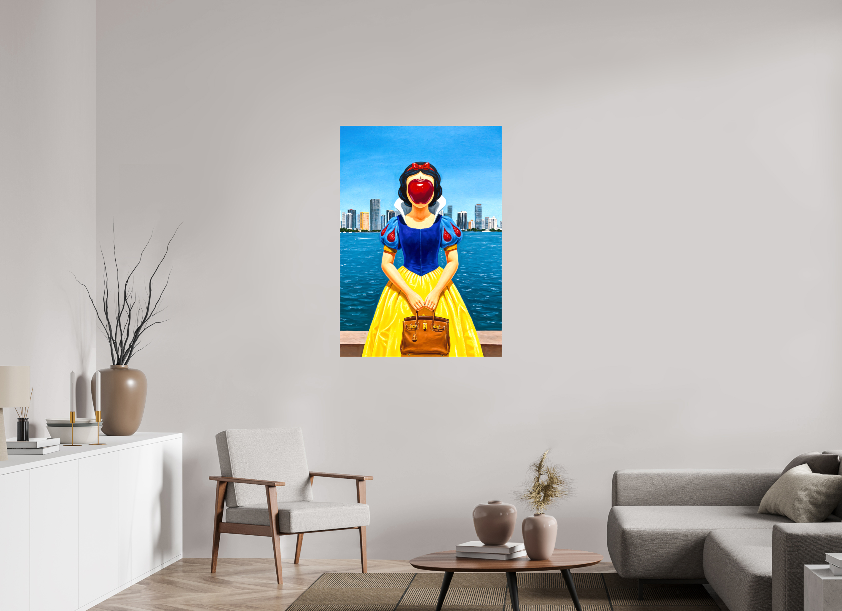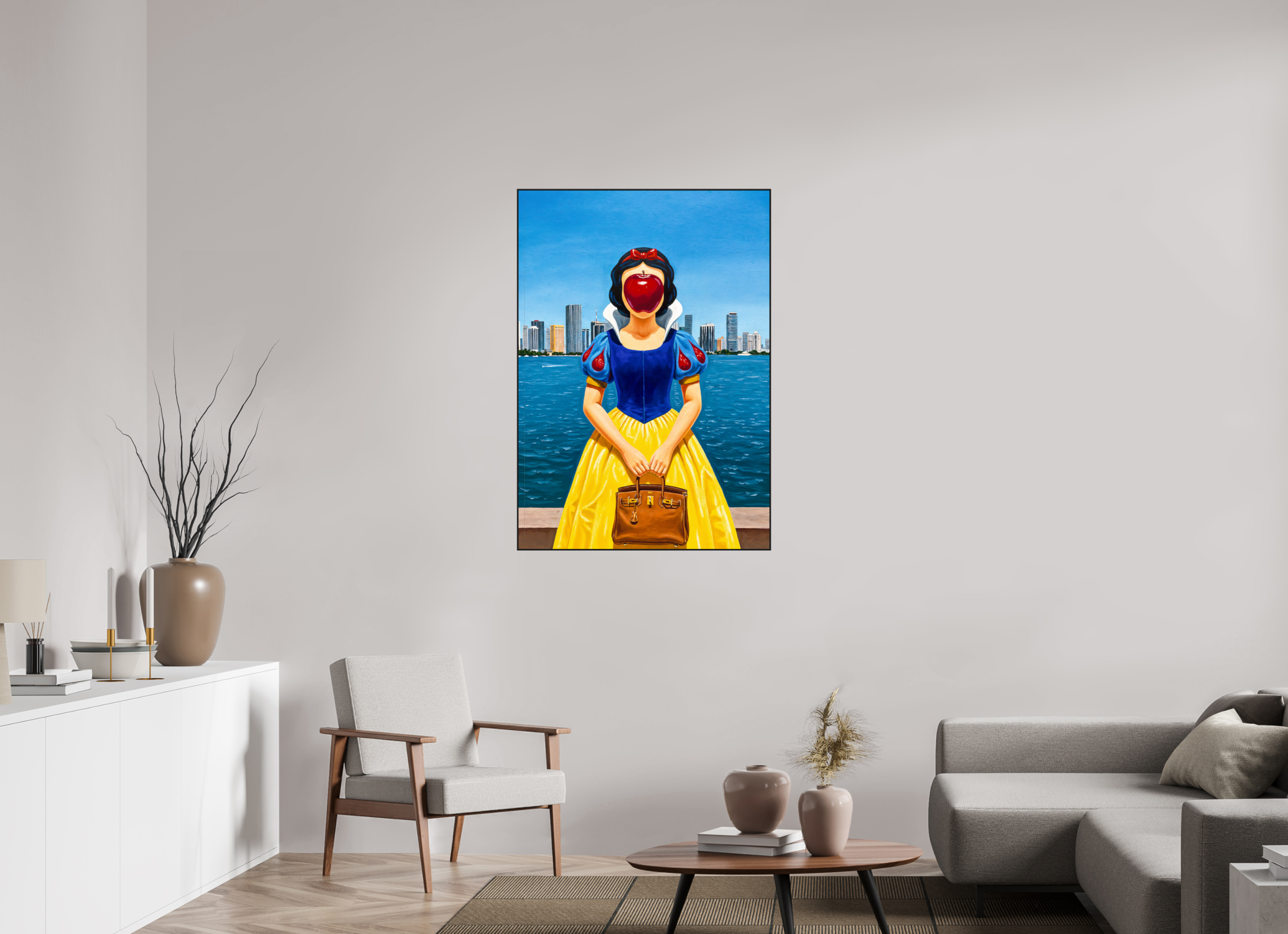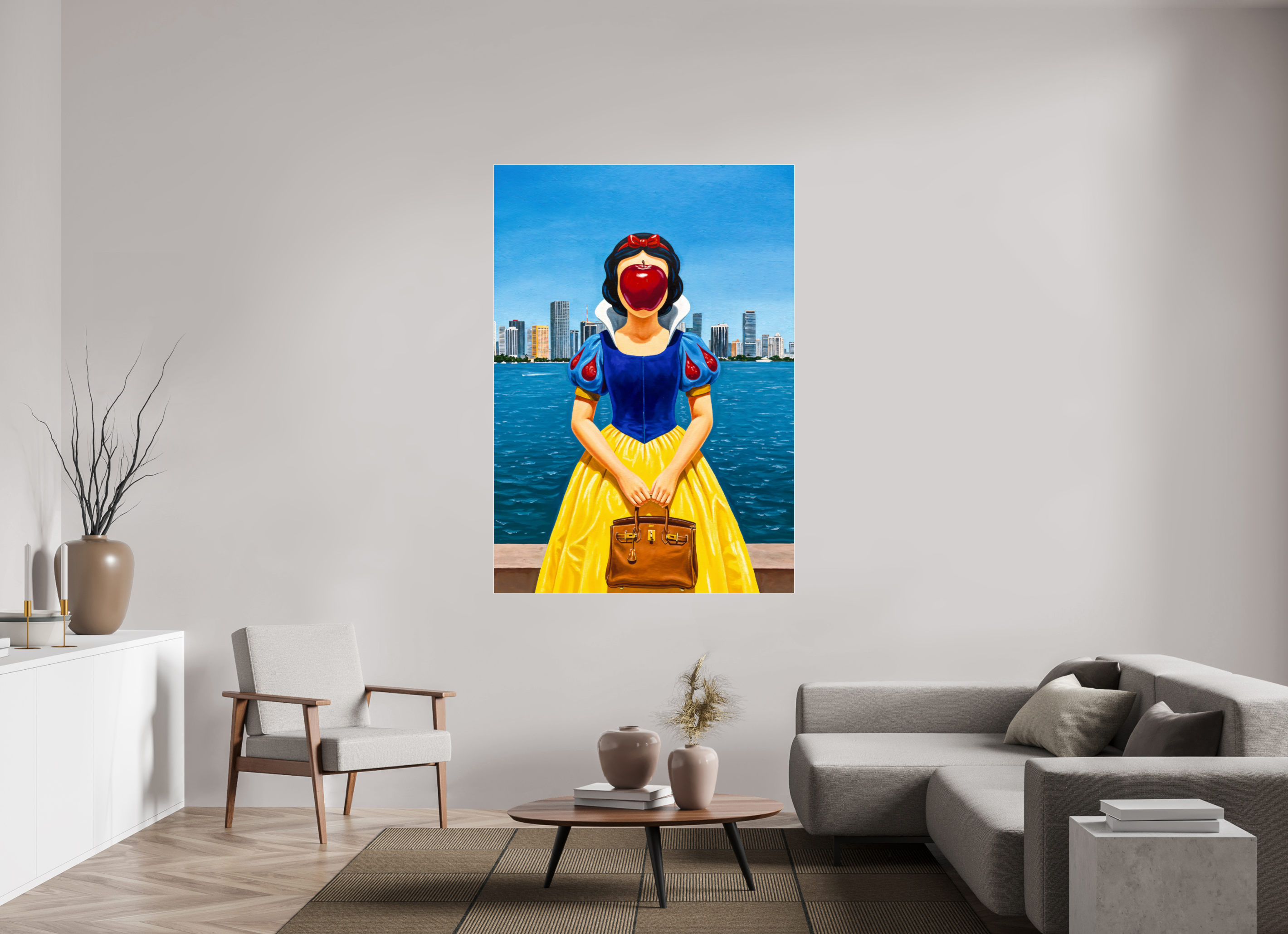 A neo-surreal spectacle where a Magritte inspired Snow White poses against Miami’s diamond skyline, flaunting a natural sable Hermès Birkin that turns fairy-tale innocence into haute-luxury iconography.