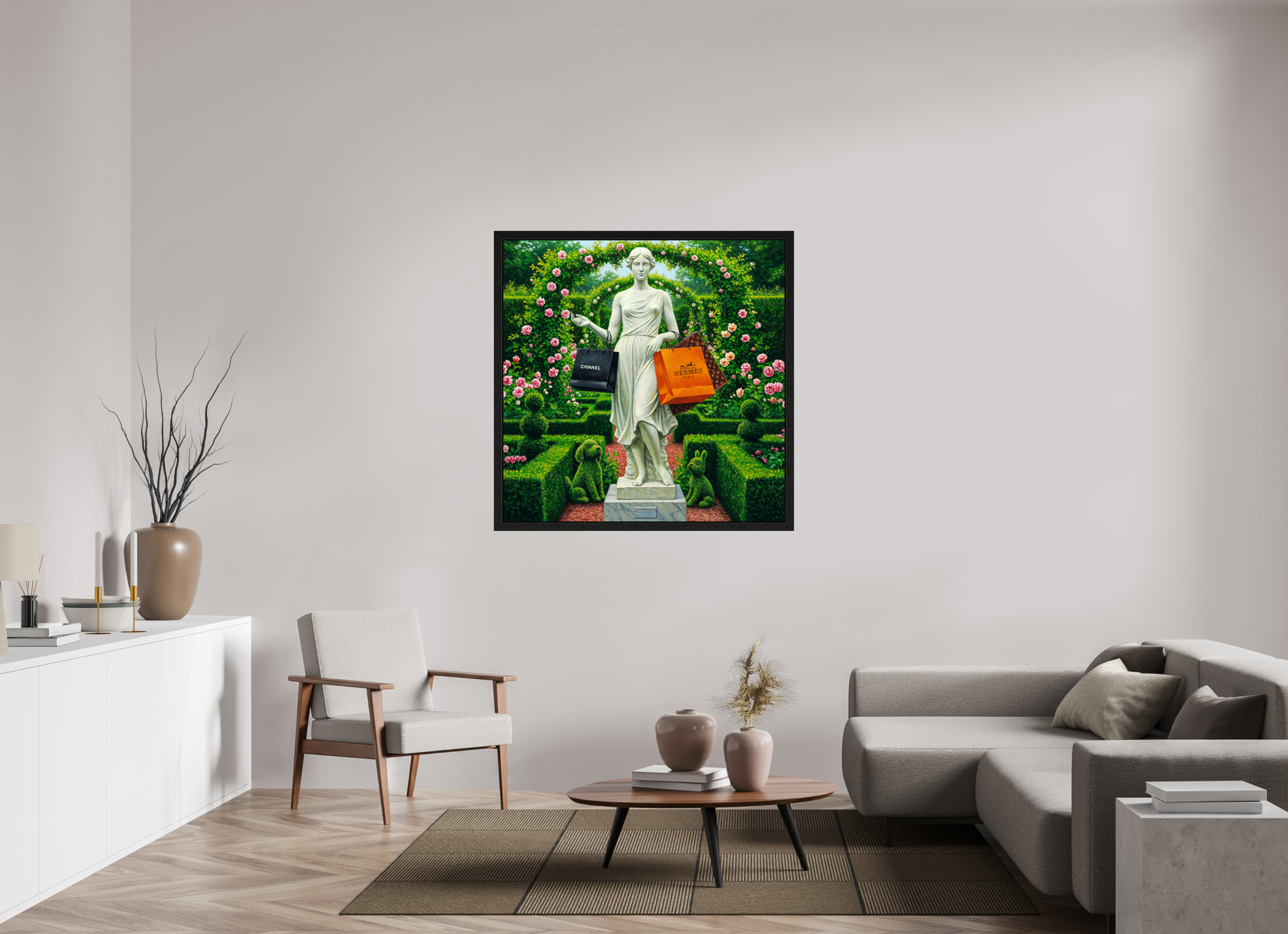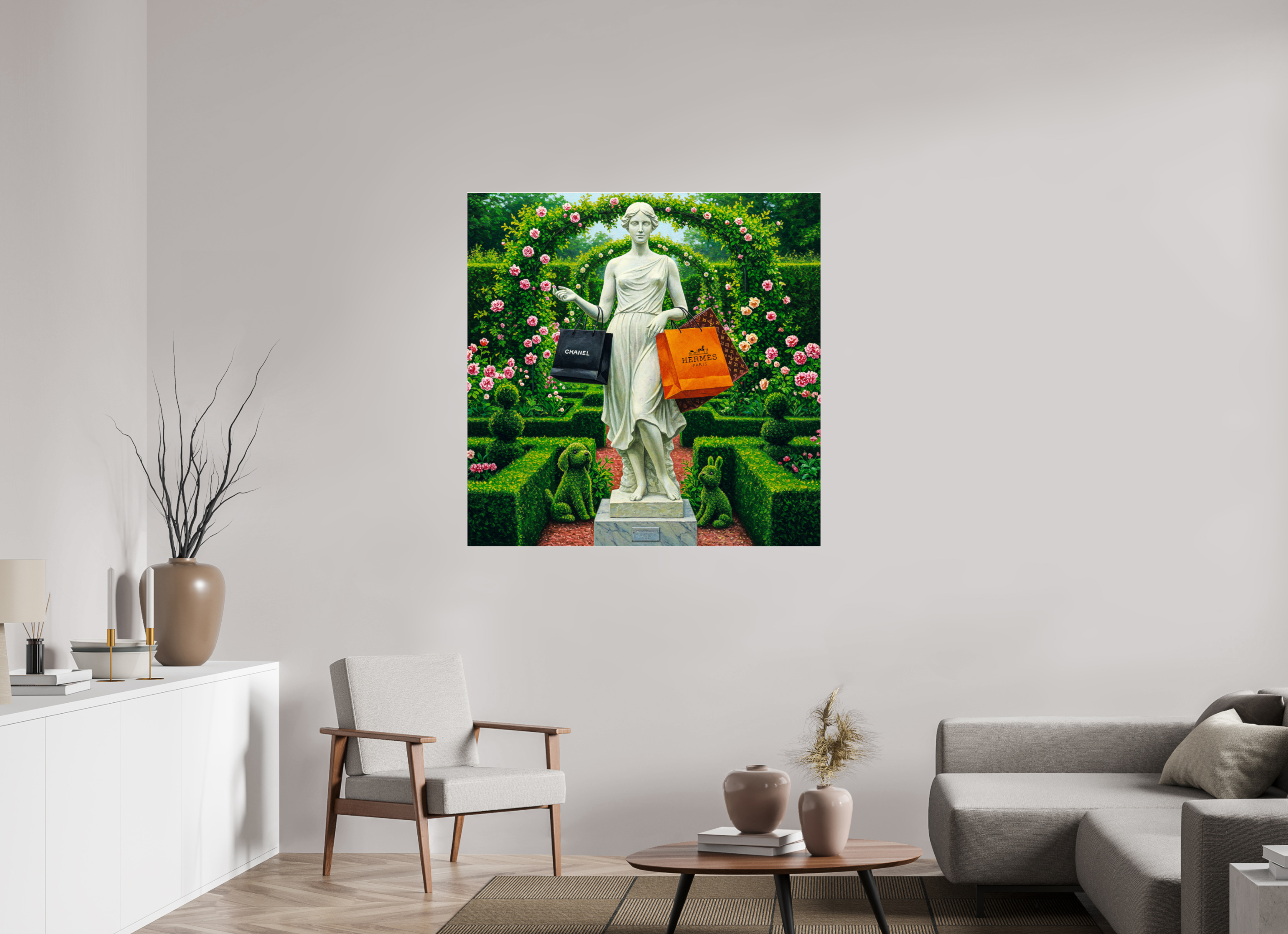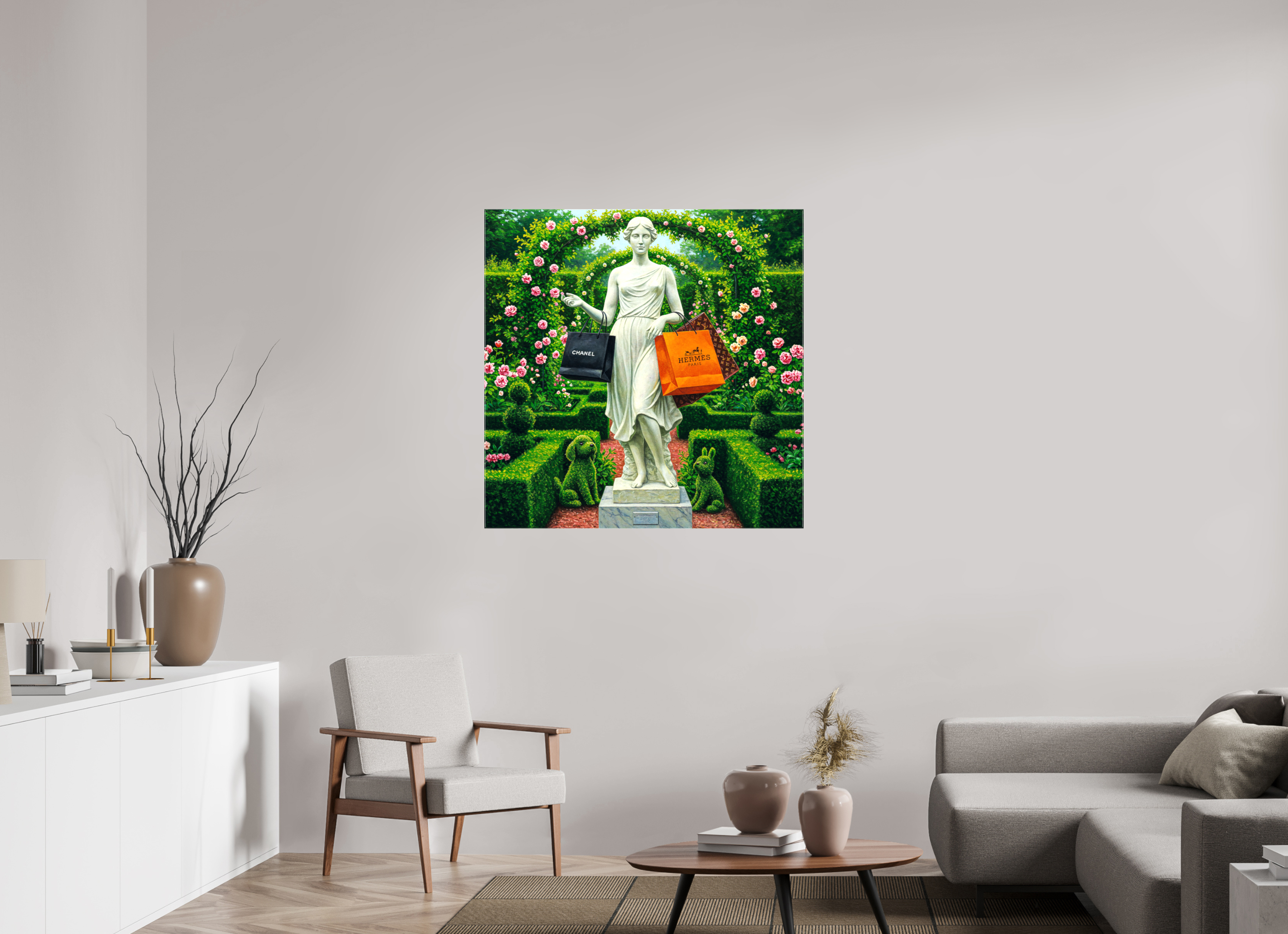 A classical marble goddess struts into the modern age, flaunting Hermès and Chanel bags with effortless poise. Nestled in a rose-trimmed topiary garden, she blurs the lines between antiquity and couture. This tongue-in-cheek masterpiece redefines luxury elevating timeless beauty with the symbols of contemporary fashion obsession.