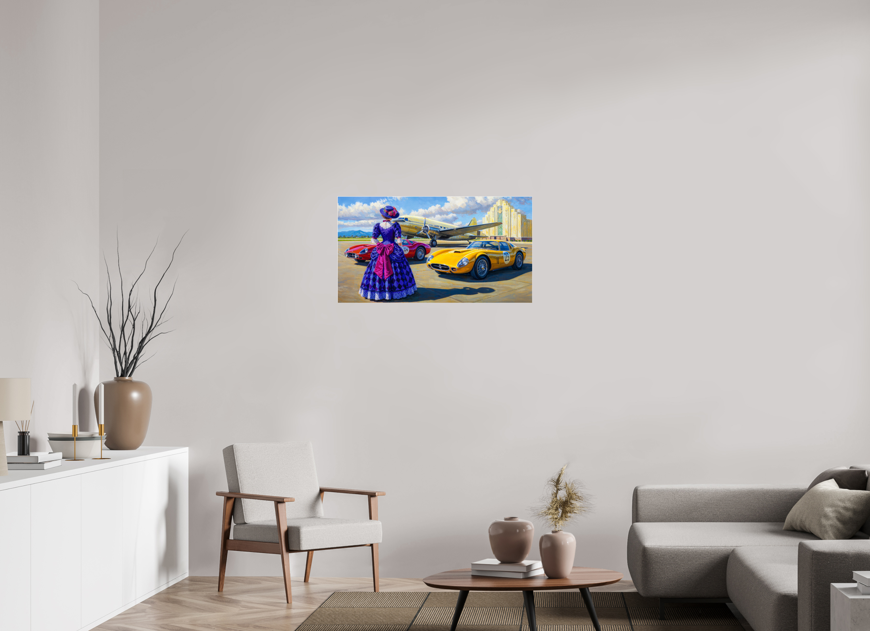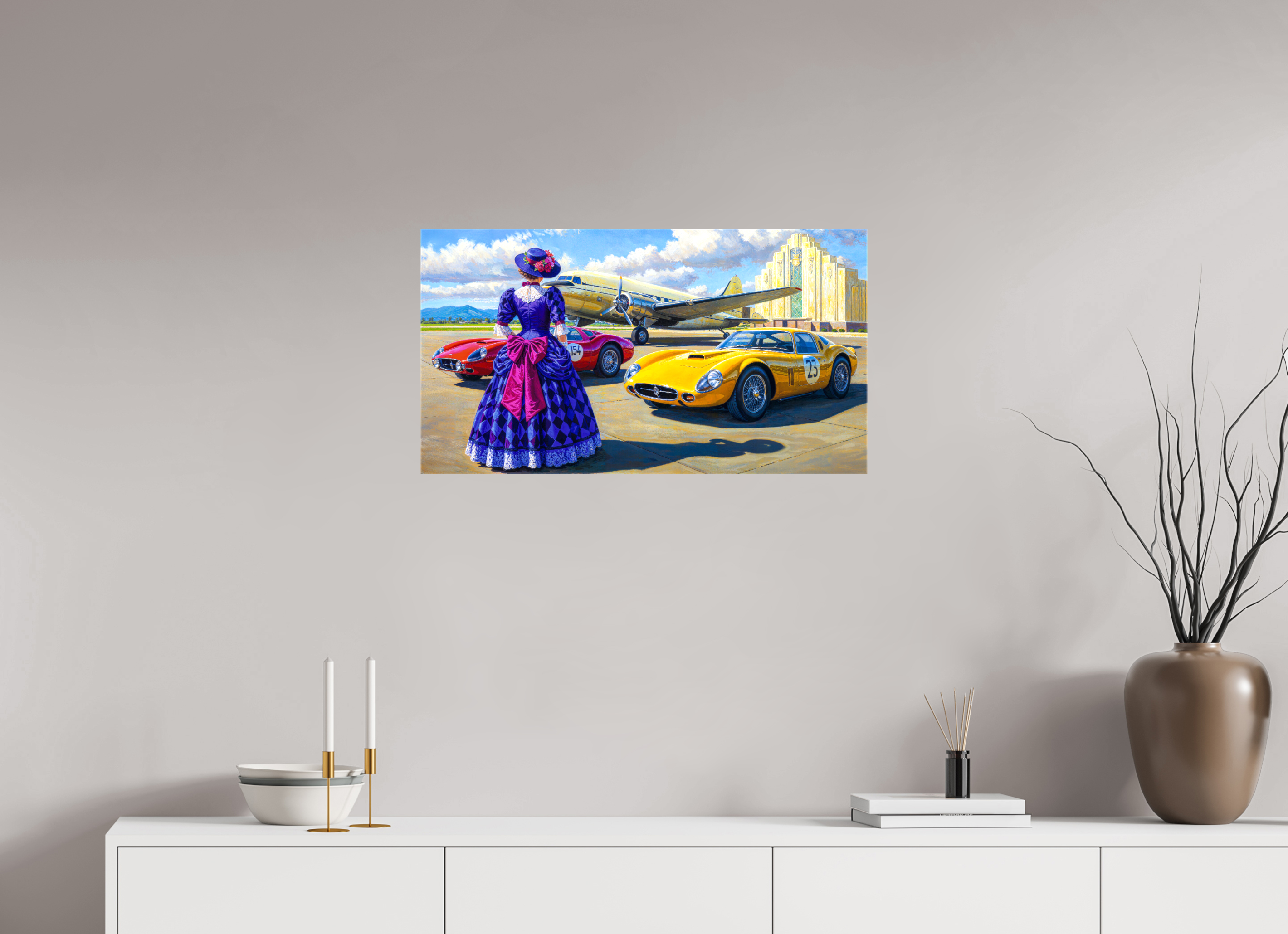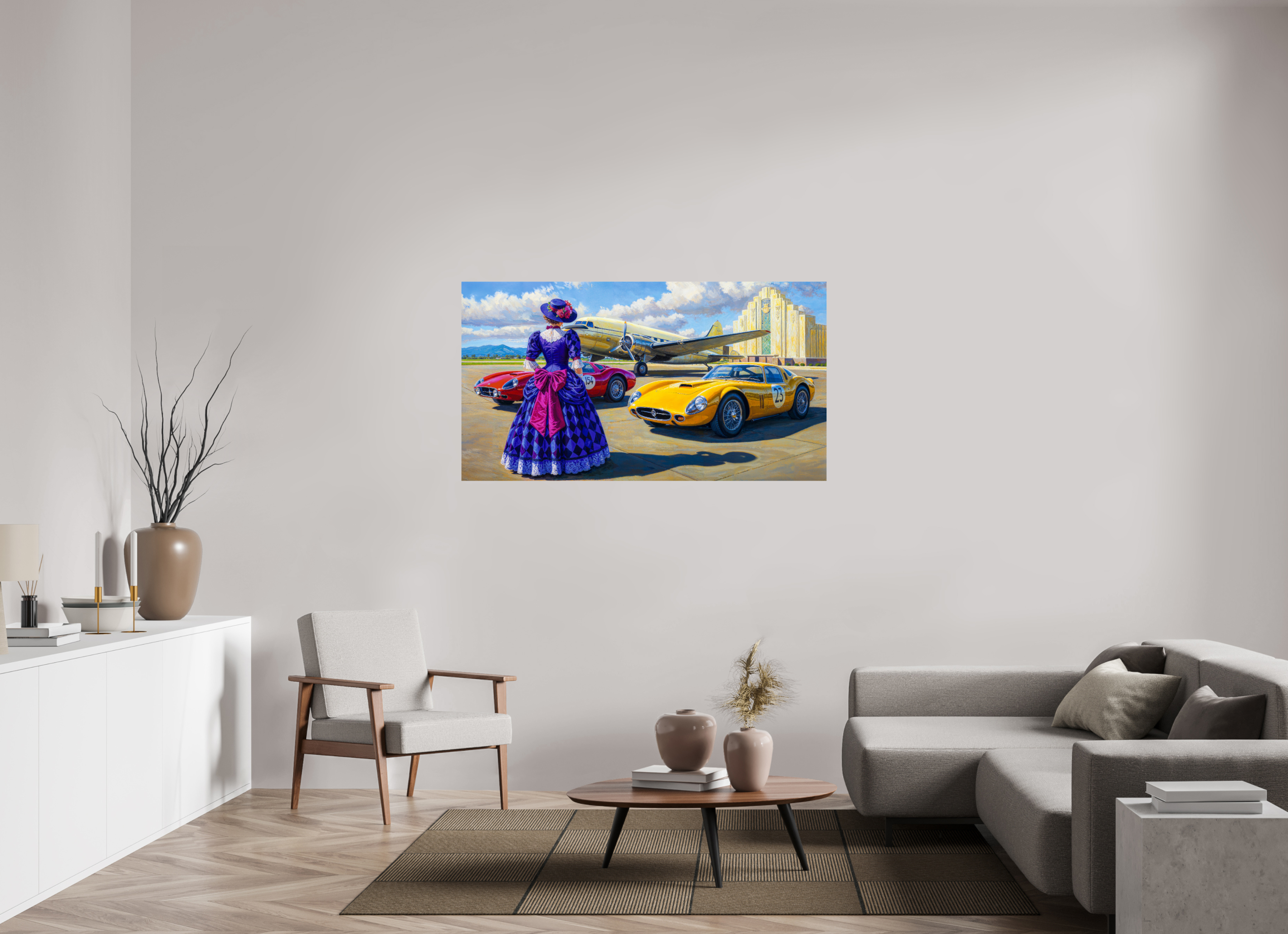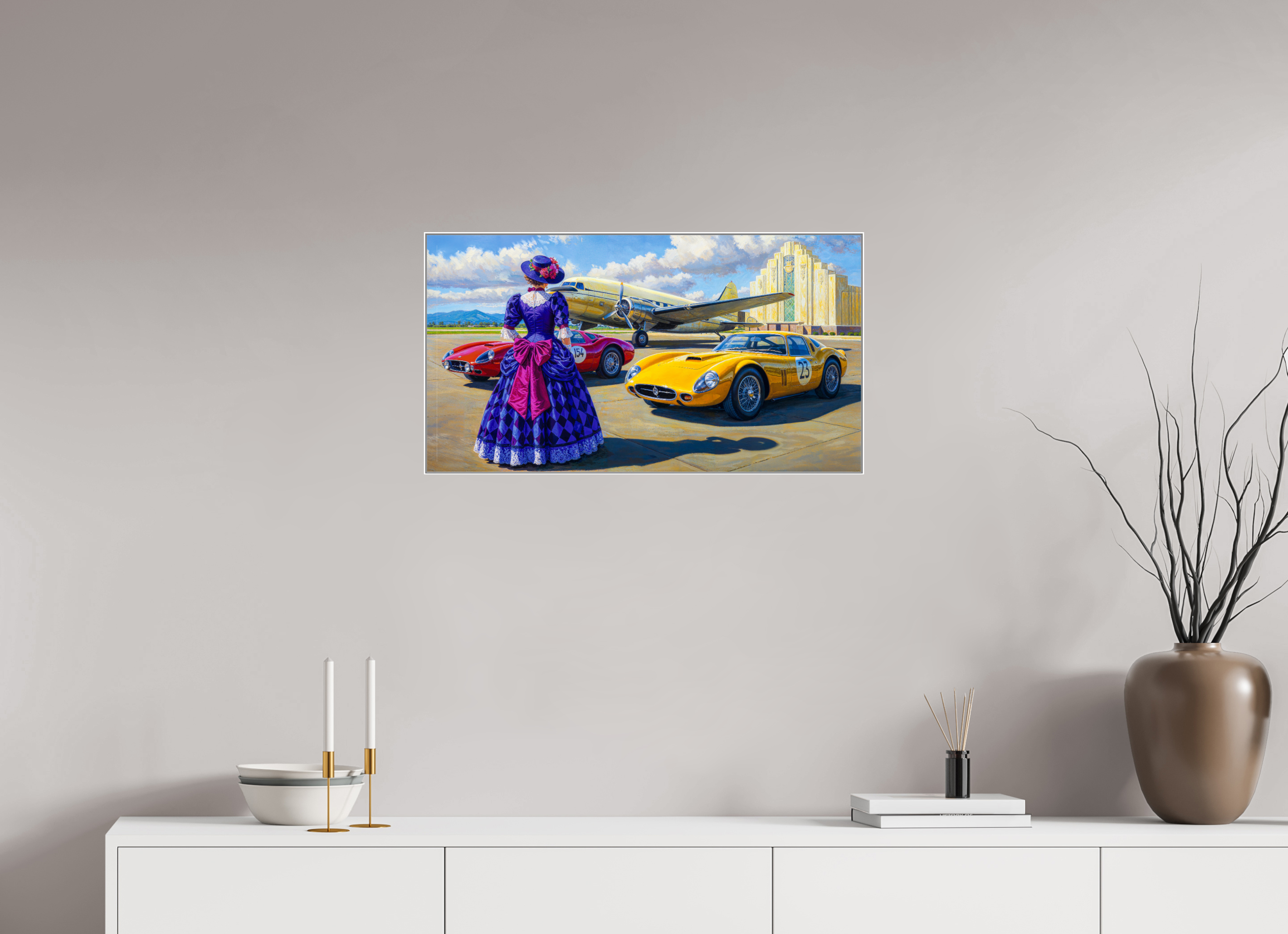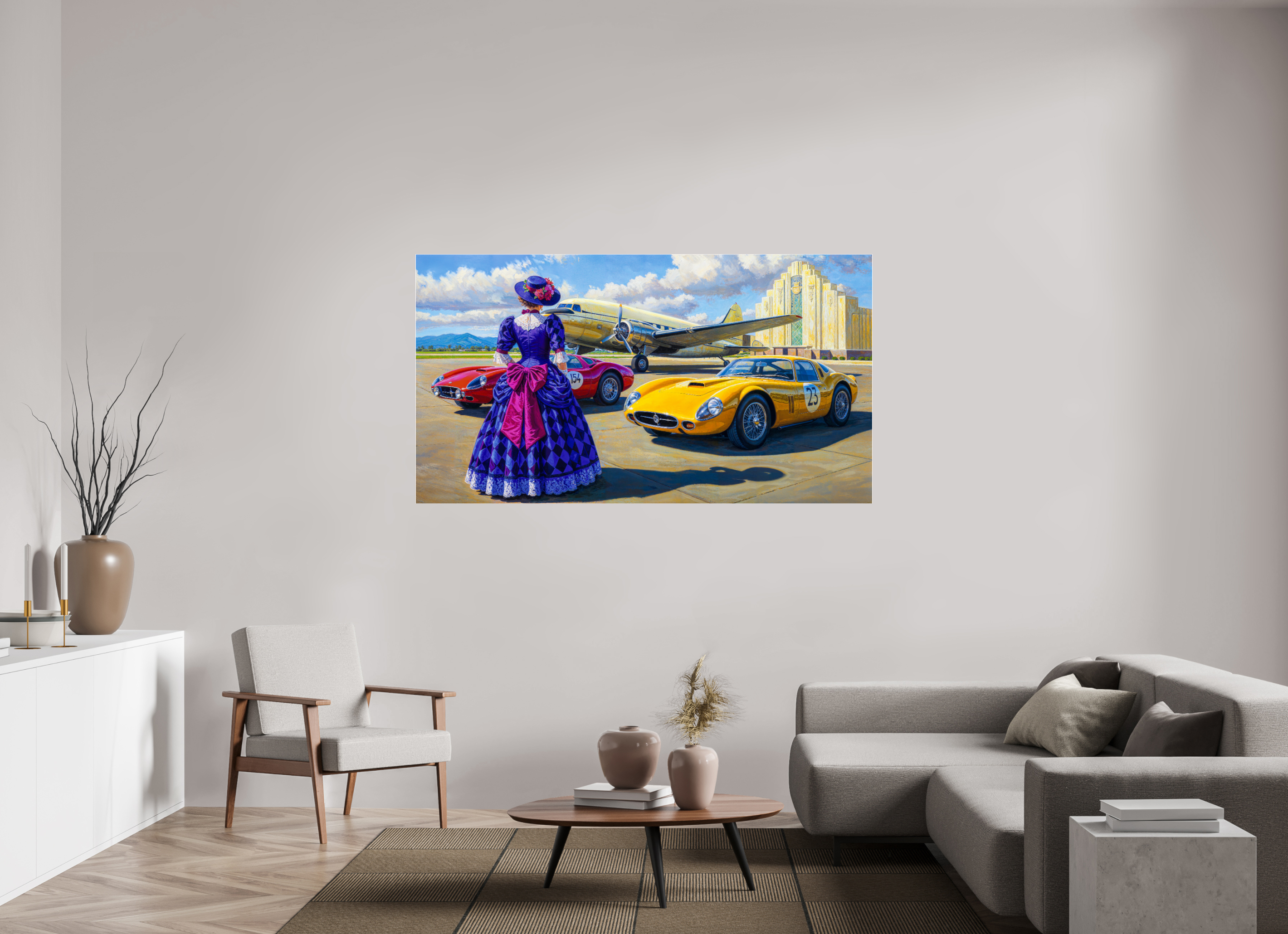 A Victorian lady in violet lace stands poised between two racing legends and a golden-age airplane, as if time itself took a detour down the runway. The clash of corset and chrome, silk and speed, evokes a cinematic daydream where elegance meets adrenaline. Art Deco architecture looms in the background, anchoring this surreal scene in glamour. It’s past meets future in a high-octane fantasy of style and flight.