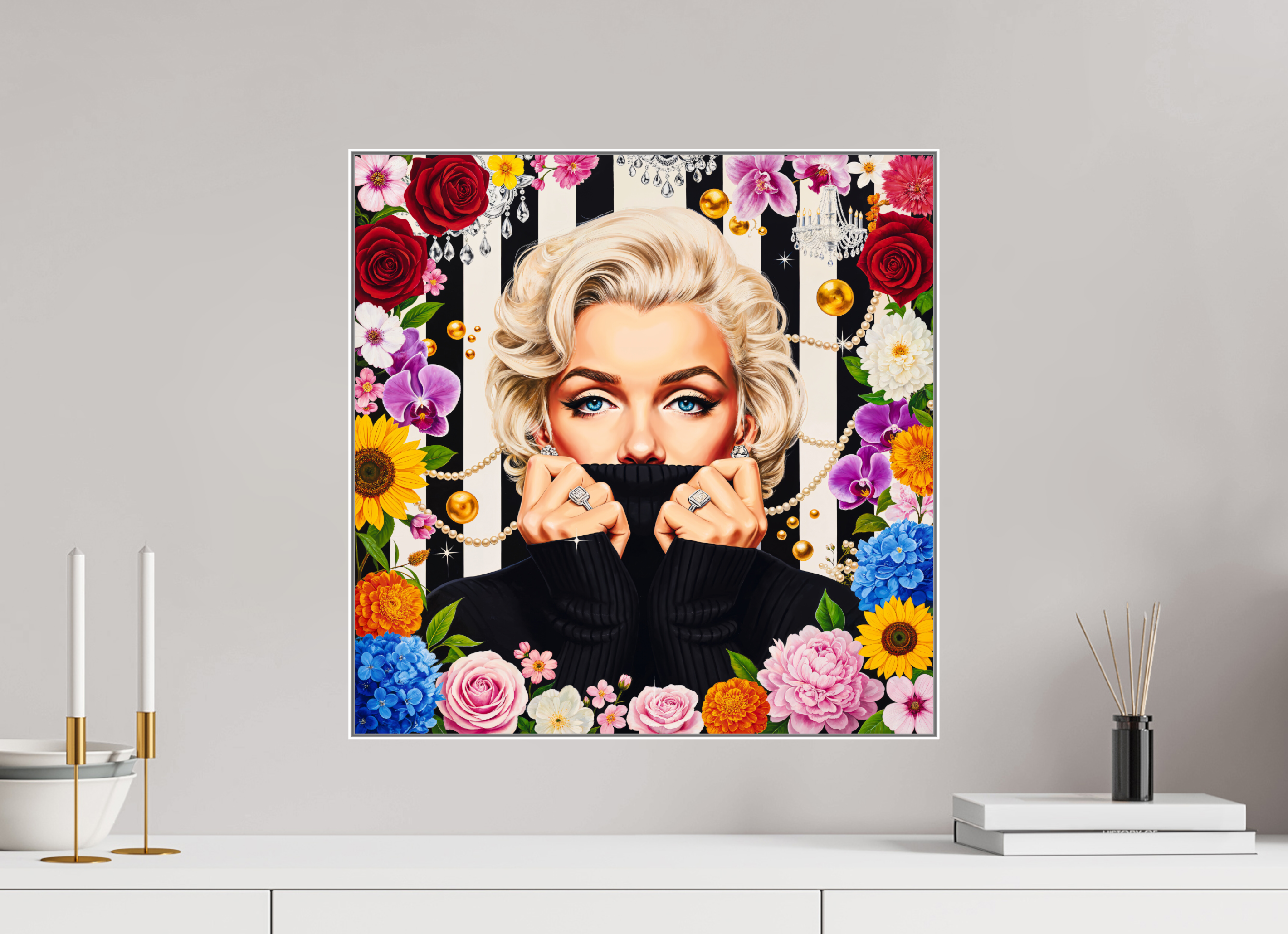 Wrapped in noir elegance and framed by a riot of florals, Marilyn peeks over her turtleneck with eyes that hold a thousand secrets. Diamonds sparkle on her fingers, pearls drape across striped wallpaper, and chandeliers twinkle in the corners like whispered glamour. It’s vintage allure reborn through pop-art opulence a portrait that blends mystery, beauty, and blooming femininity in one unforgettable gaze.